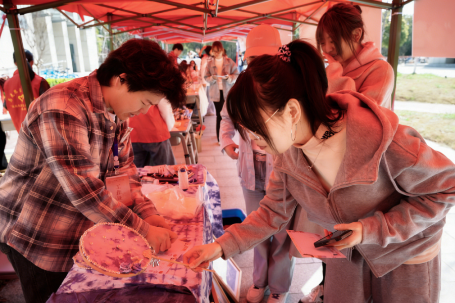“扎染古称扎缬、绞缬等,是中国民间传统染色工艺,每一道捆扎手法,都决定着最终纹样的独特走向。”法学院小角志愿队“以手为艺,以染传情”展台前,工作人员细致讲解扎染的历史渊源、文化内涵与制作技法,引得不少学子驻足聆听。“我第一次深入了解扎染,原来简单的折叠、捆扎、浸染,就能让一块白布幻化出千变万化的美丽纹样。”历史学专业2025级(1)班的刘文宇深深沉浸在传统工艺的魅力中,主动“拜师学艺”。