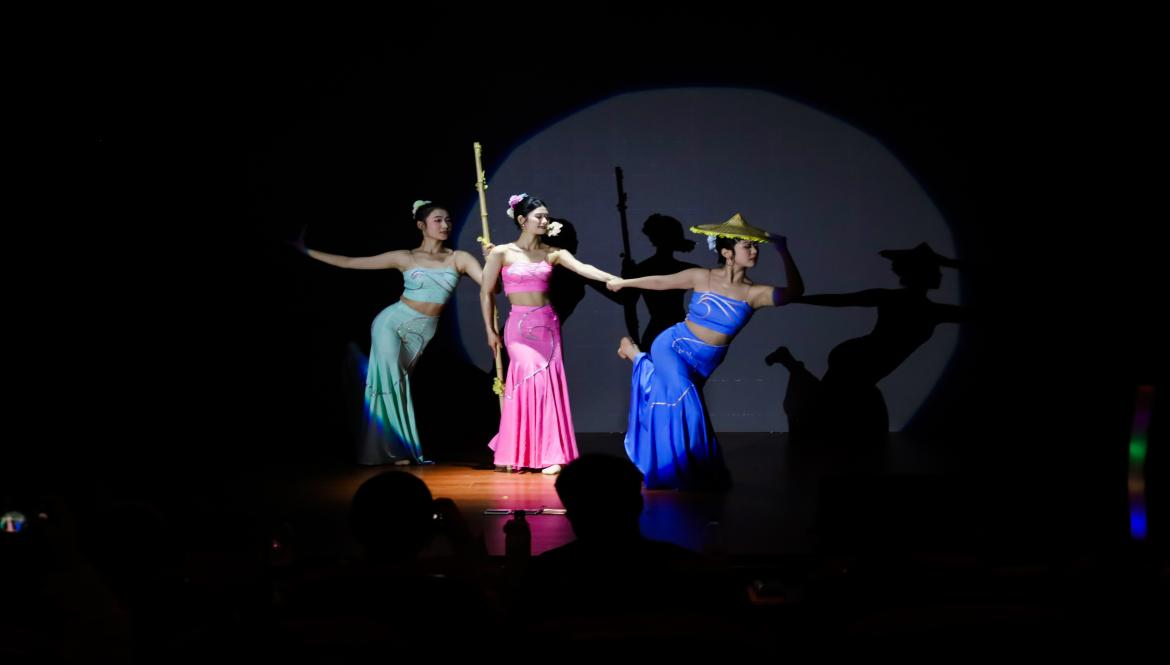 墨色山水景缓缓铺展,黄梅戏表演者身着青衫、轻挥水袖,一曲《戏曲身段》率先拉开大会帷幕。长袖翻飞间,身姿婉转如诗,将江南水乡的温婉诗意与戏曲艺术的典雅韵味勾勒得淋漓尽致;傣族舞《邵多丽》中,三位舞者身着明艳筒裙,手执竹制斗笠,以柔美灵动的身段、轻盈曼妙的舞步,细腻描摹傣家少女的灵动俏皮,将傣家风情的温婉灵动展现得恰到好处。来自“长稠舞韵”团队的戏曲舞蹈则刚柔并济,既有传统戏曲的婉约雅致,又有舞台表演的铿锵力道,动作干净利落、韵律绵长,将戏曲身段的精髓与舞蹈的感染力完美融合,生动塑造出兼具古典韵味与青春风采的舞台形象。